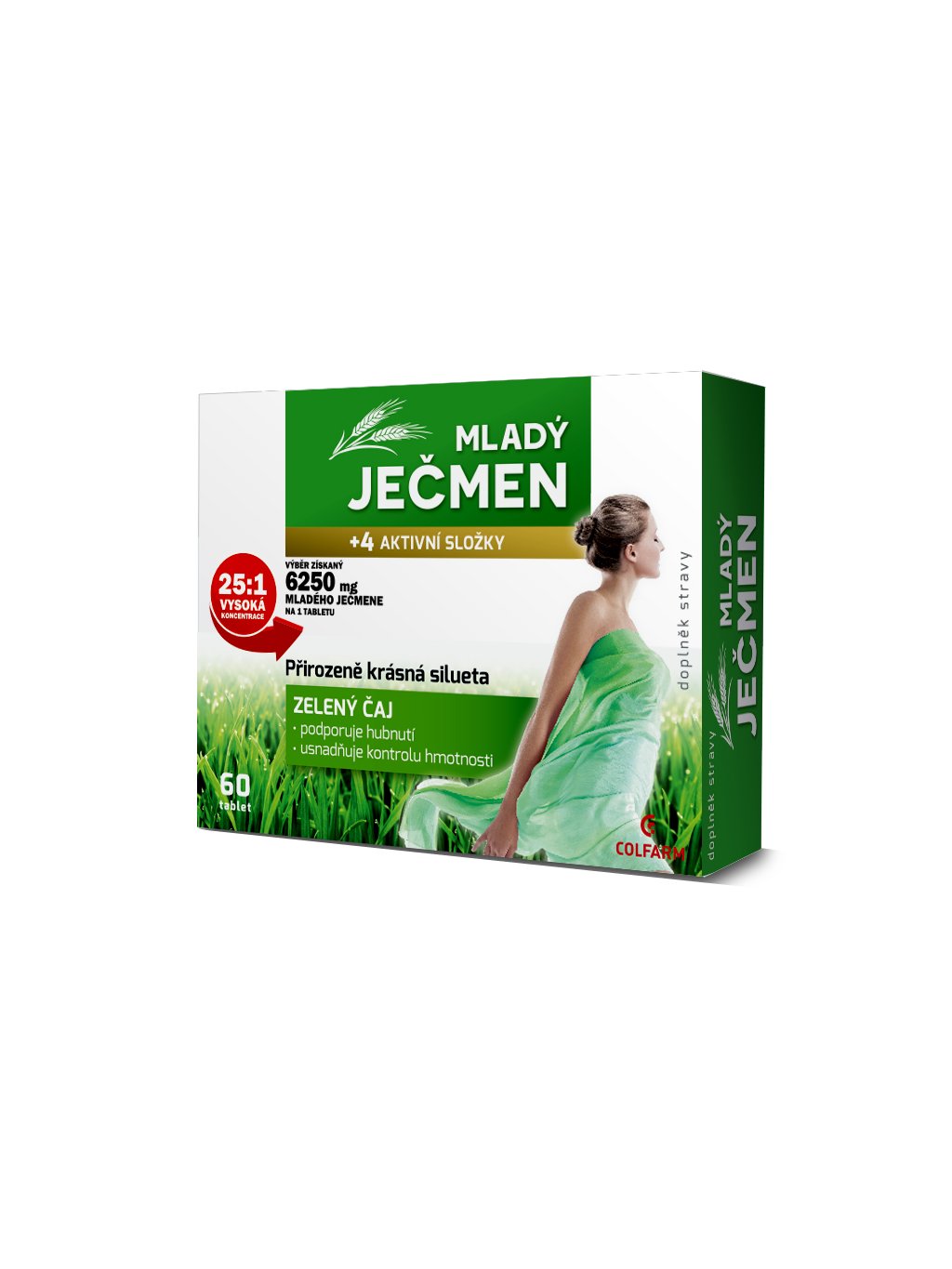 Přirozeně krásná silueta. COLFARM Mladý ječmen obsahuje kombinaci přírodních extraktů z mladého ječmene, zeleného čaje, hořkého pomeranče a řasy spiruliny doplněné chromem. Mladý ječmen dodává tělu řadu cenných látek. Je zdrojem důležitých vitaminů, minerálů, antioxidantů a enzymů, poskytuje celkové povzbuzení organismu. Výtažky ze spiruliny, ječmene a zeleného čaje přispívají k antioxidační ochraně těla. Zelený čaj podporuje hubnutí, usnadňuje kontrolu hmotnosti. Spirulina je přírodním zdrojem vitaminů, minerálů, chlorofylu, bílkovin a dalších účinných látek. Chróm je stopový prvek nezbytný pro mnoho biologických funkcí, účastní se celé řady metabolických procesů v lidském těle.
