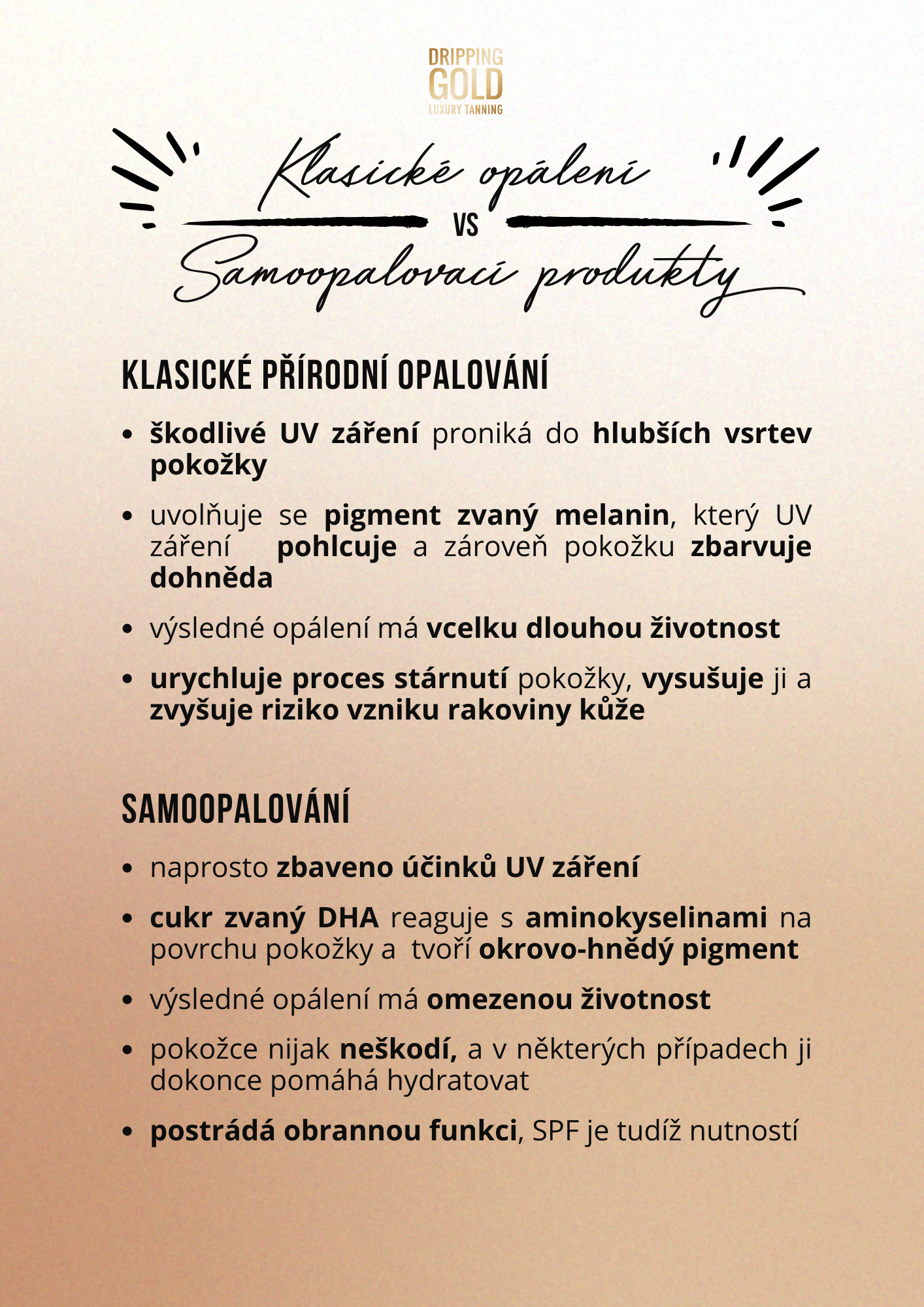 Samotný proces se v mnohém podobá přírodnímu opalování, a přitom šikovně obchází veškerá nebezpečí spjatá s UV zářením. Zdá se tedy, že jsme žádný háček nenašli! Samoopalování je (doslova) zlatou střední cestou, elegantně kombinující zdraví i krásu.