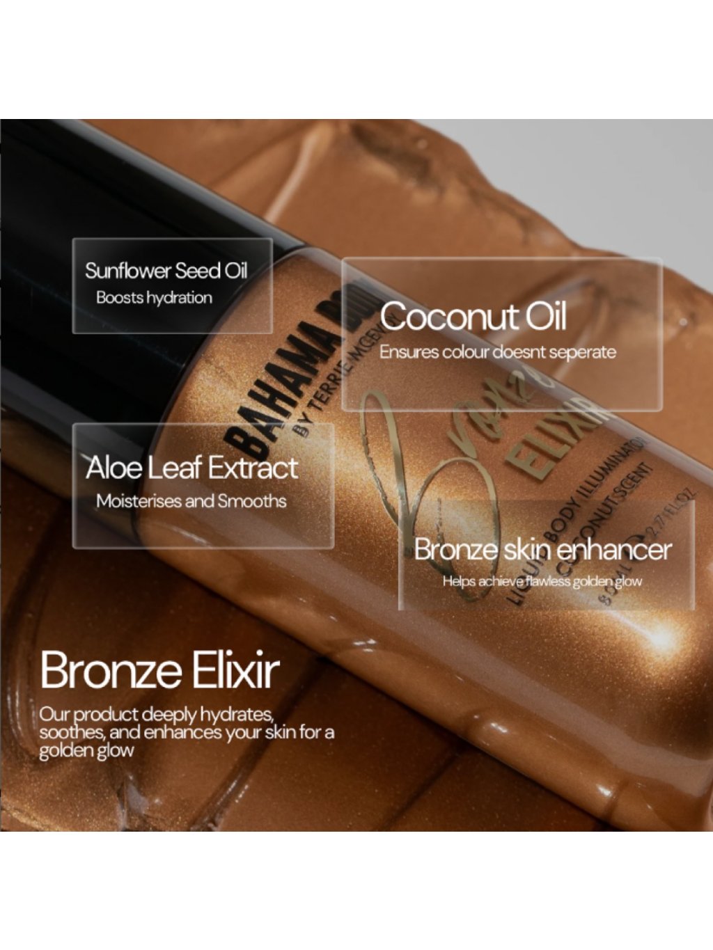 Bahama Body Bronze Elixir je dokonalý instantný bronzový prípravok pre dosiahnutie bezchybného opálenia a lesku pokožky!hodný na použitie na celé telo, táto luxusná formula je obohatená o ošetrujúce zložky, ako je olej zo slnečnicových semienok, kokosový olej a extrakt z listov aloe.Bronze Elixir nerovnosti a dodáva pleti svieži, lesklý finiš, ktorý dokonale zvýrazní vaše opálenie.