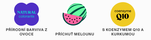 Glukózový sirup, cukr, voda, kyselina askorbová, želírovací látka (pektin), okyselující látka (kyselina citronová), ergokalciferol, regulátor kyselosti (trisodný citrát), citrát zinečnatý, tyndalizovaná směs probiotik (L. rhamnosus a B. lactis), přírodní aroma, koenzym Q10, extrakt z kurkumového kořene (Curcuma longa), rostlinný olej (kokosový olej), barvivo (paprikový extrakt E-160), vitamin B12 (kyanokobalamin), protispékavá látka (karnaubský vosk), seleničitan sodný.