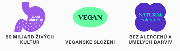 GOFOS™ Fruktooligosacharidy, inulin, směs bakteriálních kmenů (Lactobacillus acidophilus, Lacticaseibacillus rhamnosus, Bifidobacterium animalis subsp. lactis, Lactobacillus gasseri, Lactobacillus jesenii, Lactobacillus crispatus, Lactiplantibacillus plantarum subsp. plantarum), vegetariánská kapsle (hydroxypropylmethylcelulóza), vitamin E (D-alfa-tokoferol acetát), přírodní aroma, protispékavá látka (hořečnaté soli mastných kyselin).